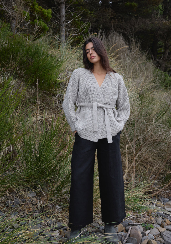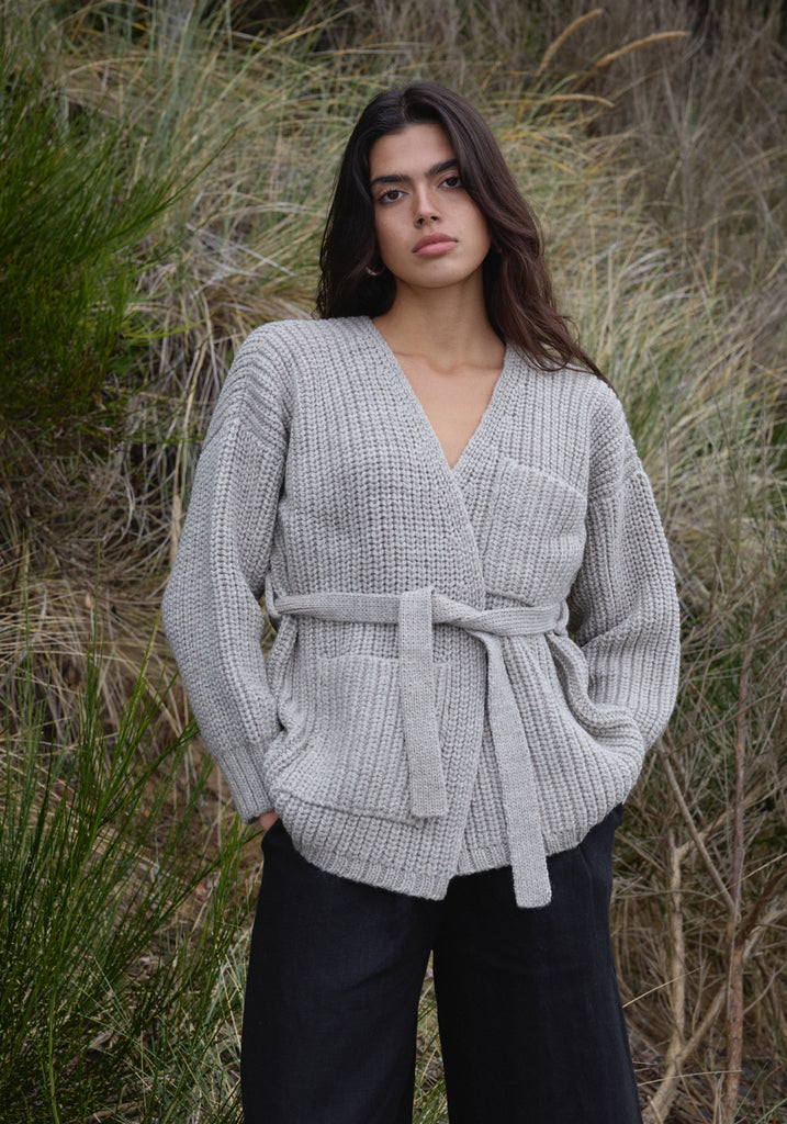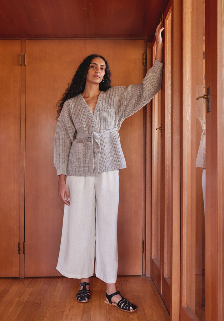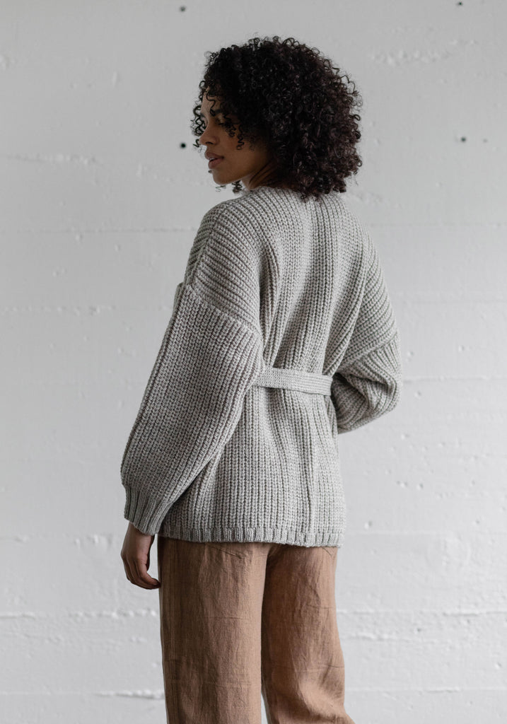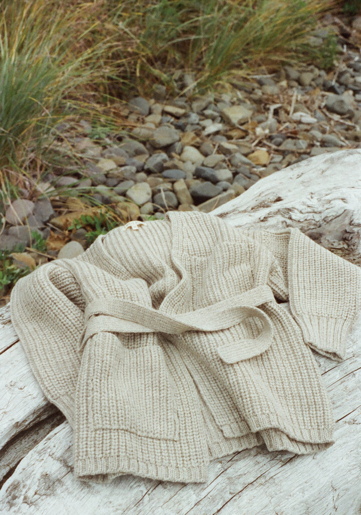 A customer favorite returns to the Andean Highland Wool Collection. We love this yarn for its exceptional soft hand feel and for the structure it brings to our knits this season. Styled with a wide bulky stitch, front pockets, and an adjustable belt closure to wrap up for cold days ahead.
