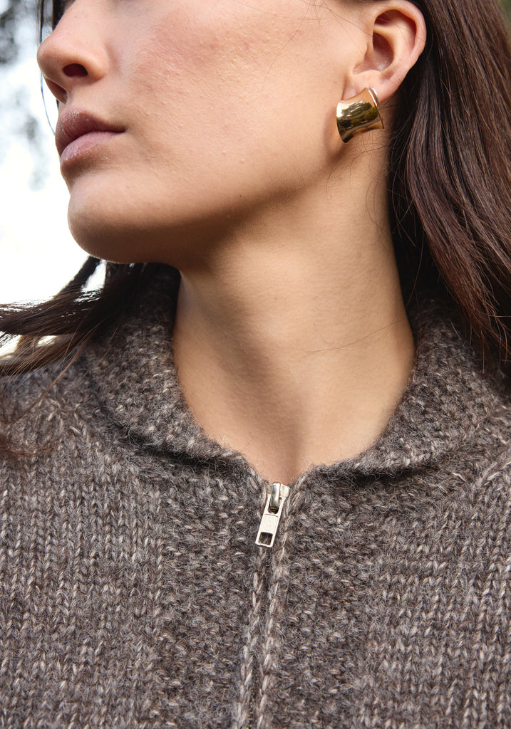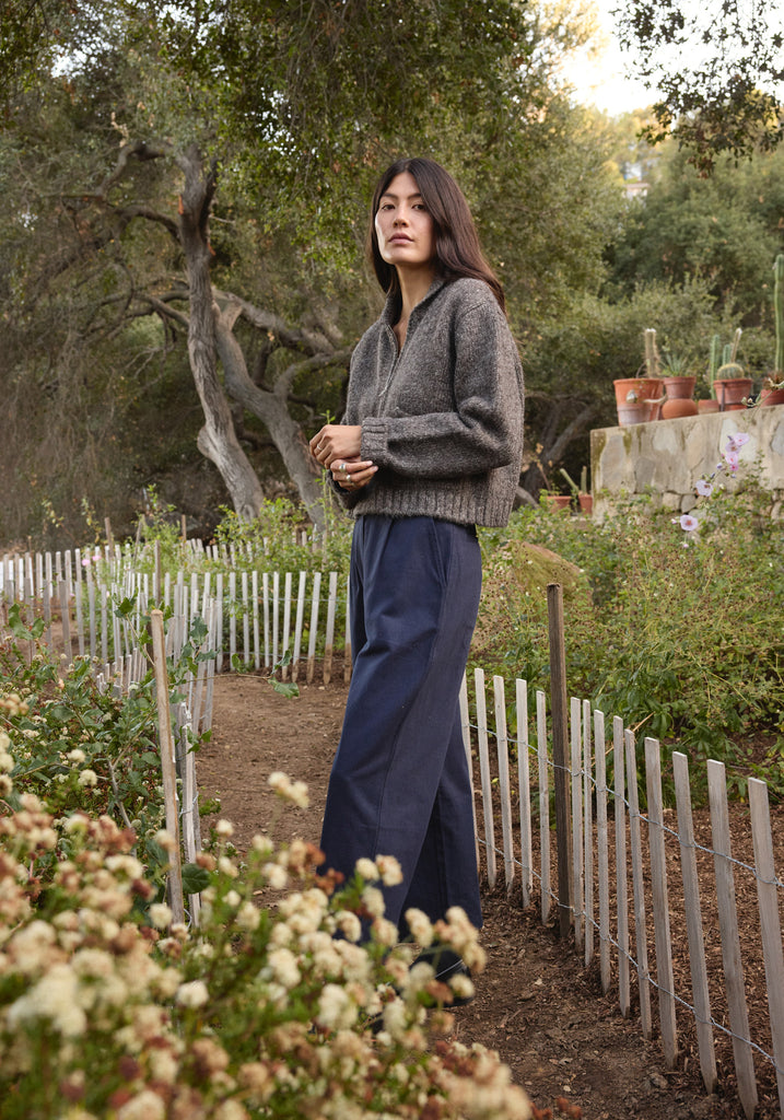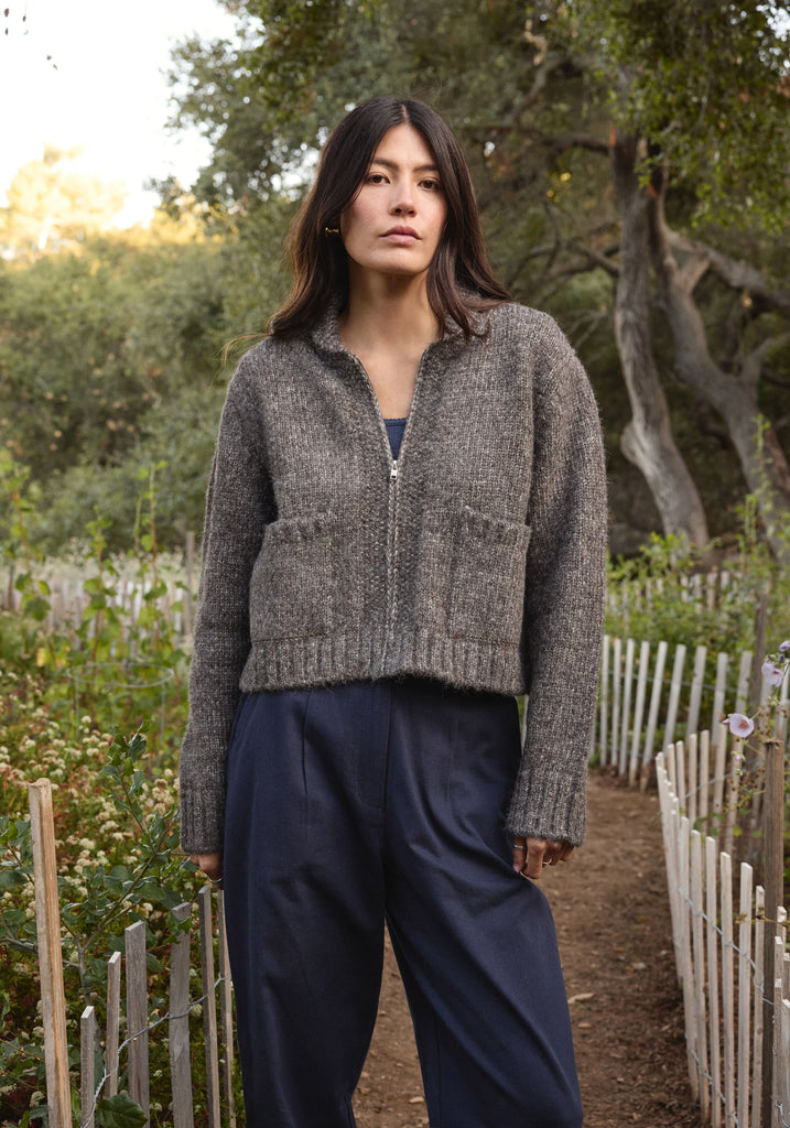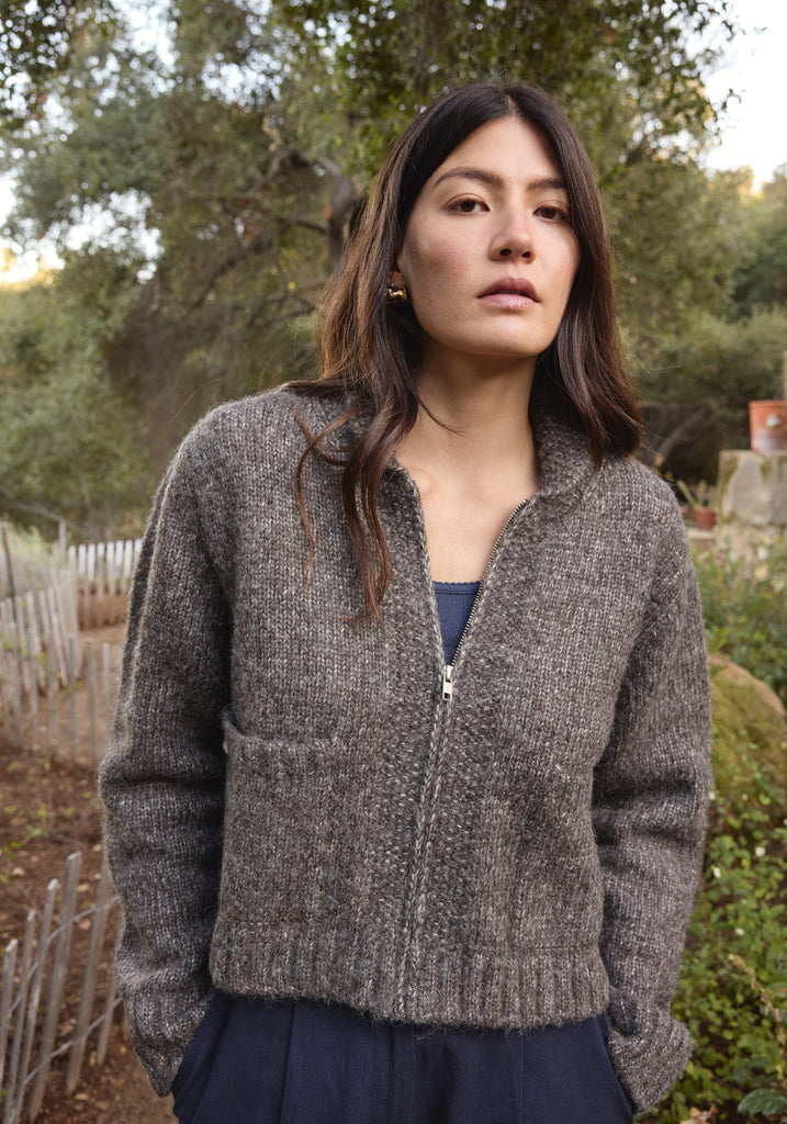 Our favorite lofty Alpa Cotton yarn is back this season and has been a First Rite customer favorite for a reason. The blend of cotton with alpaca creates insulation with a surprisingly light overall weight and the undyed yarns create a beautiful and subtle melange. The zip up cardigan is an easy everyday layer with just the right amount of detail. Zips up the front with a contrast textured placket and collar and two front pockets.