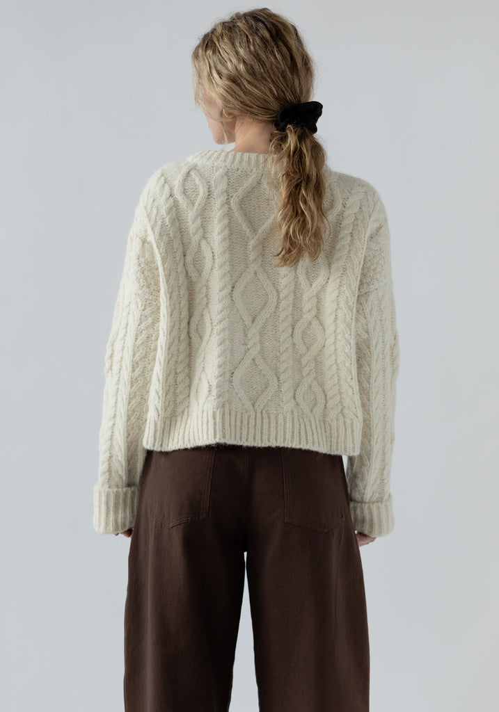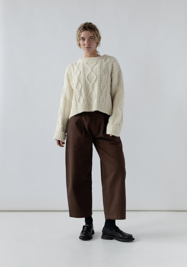 Our favorite lofty Alpa Cotton yarn is back this season and has been a First Rite customer favorite for a reason. The blend of cotton and alpaca creates insulation and volume with a surprisingly light overall weight. The undyed yarns create a beautiful and subtle melange that when knitted into the detail of our cable pullover is perfection. Designed with a lightly oversized fit and extra long cuff to adjust to your perfect length.