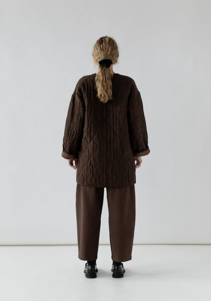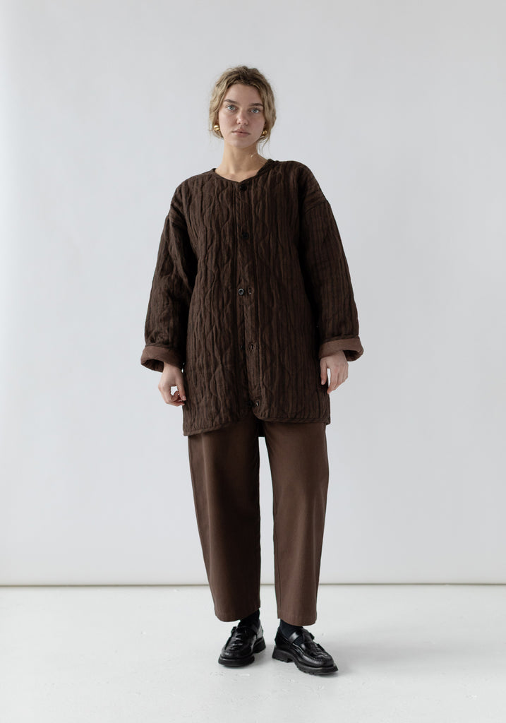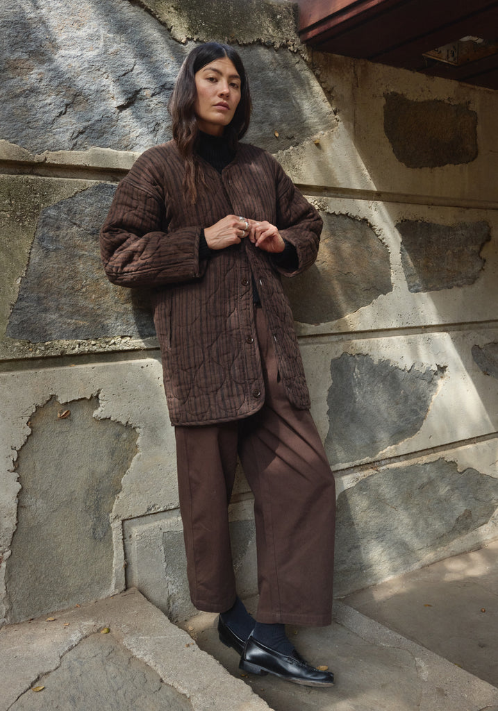 Back in stock to the quilted outerwear collection, the Quilted Coat. We sourced a beautiful range of linen and cottons to create a warm and structured coat to layer up or down as the weather cools. Designed with a mid length oversized fit, two front pockets, and tonal corozo nut buttons.