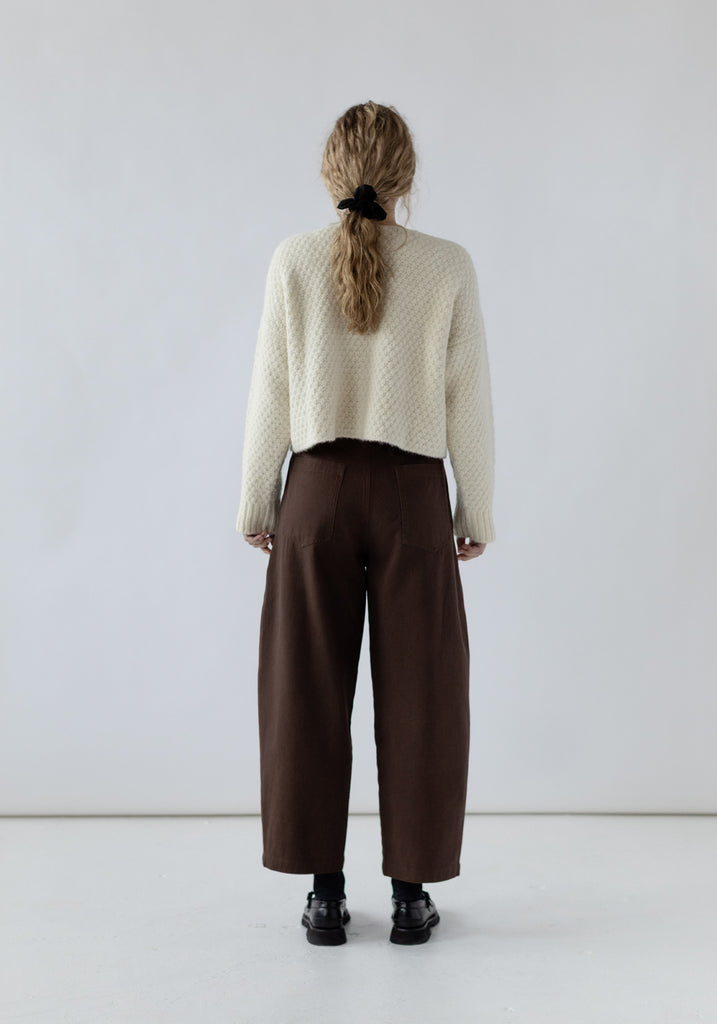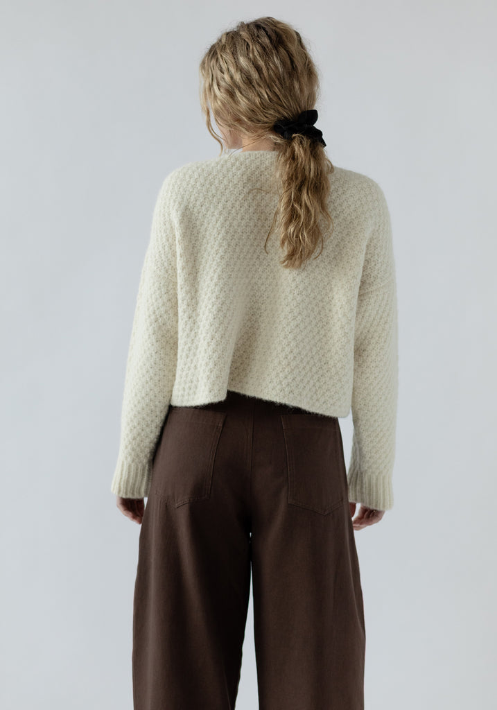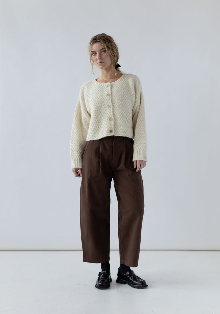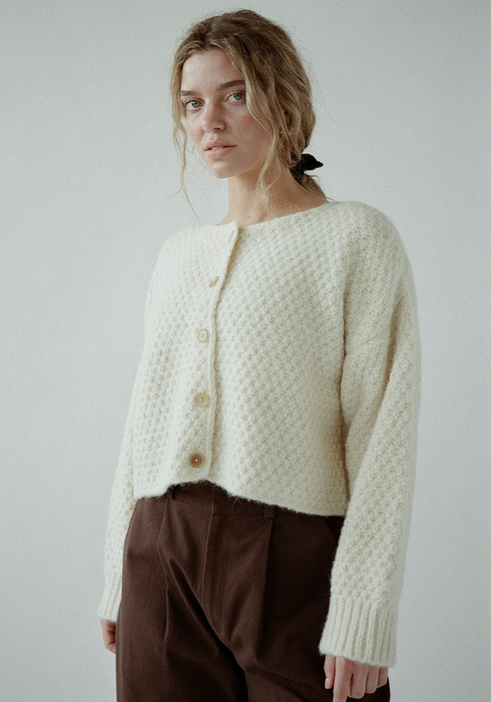Our favorite lofty Alpa Cotton yarn is back this season and has been a First Rite customer favorite for a reason. The blend of cotton and alpaca creates insulation and volume with a surprisingly light overall weight and the undyed yarns create a beautiful and subtle melange. The Quinn Cardigan was a customer favorite last season and we are excited to introduce it to the Alpa Cotton collection. Designed with a slightly oversized fit and textured chunky stitch, and closes with horn buttons down the center.