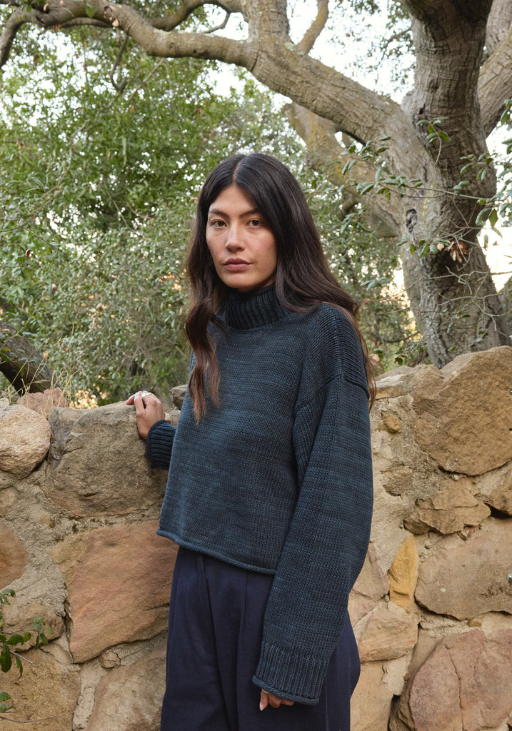 The Roll Turtleneck is designed with a slightly cropped fit, roll hem details, and a low turtleneck.