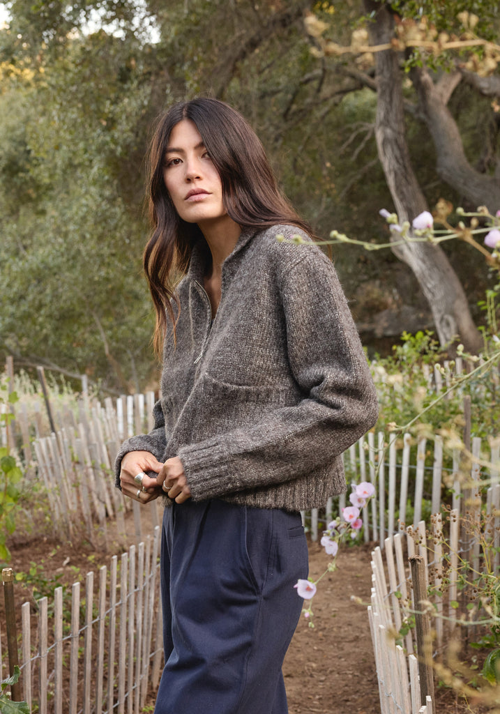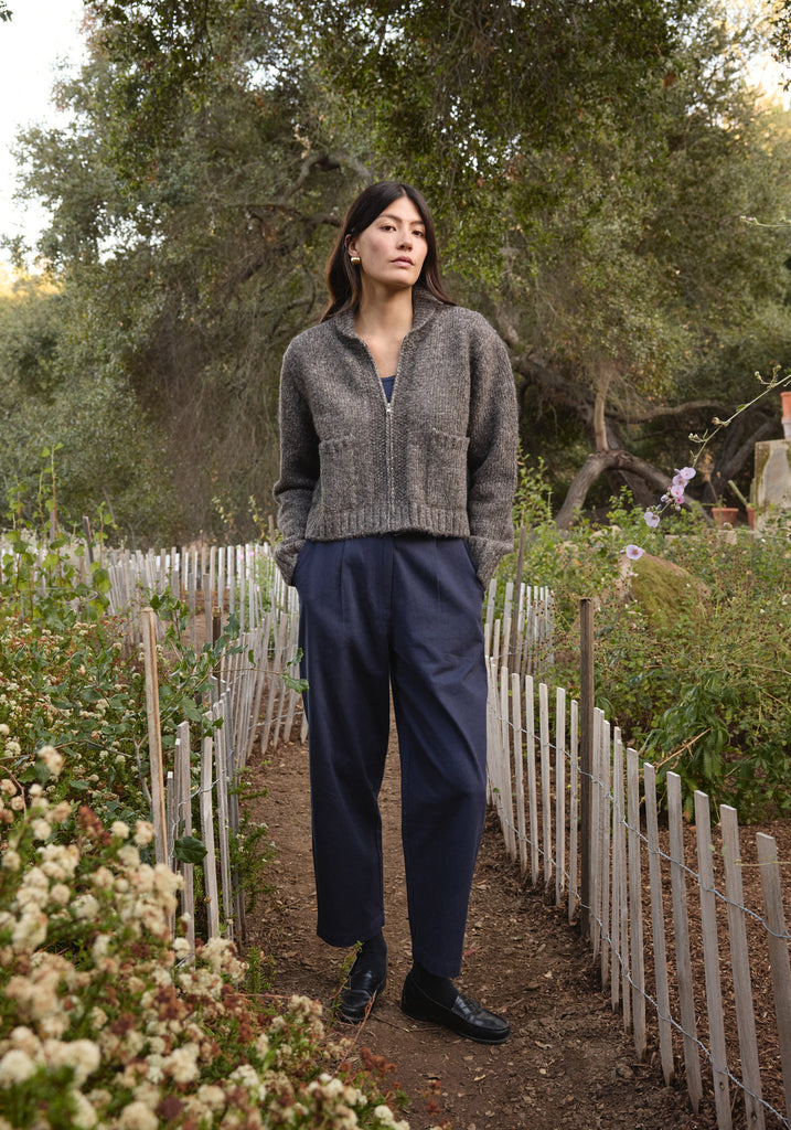 Our favorite lofty Alpa Cotton yarn is back this season and has been a First Rite customer favorite for a reason. The blend of cotton with alpaca creates insulation with a surprisingly light overall weight and the undyed yarns create a beautiful and subtle melange. The zip up cardigan is an easy everyday layer with just the right amount of detail. Zips up the front with a contrast textured placket and collar and two front pockets.