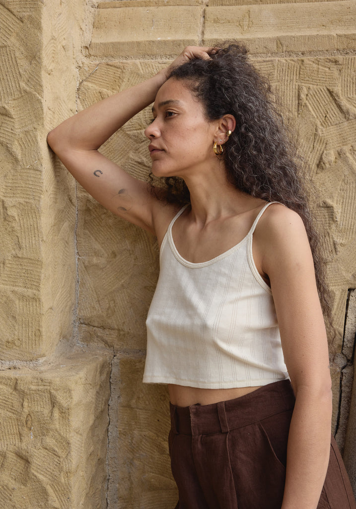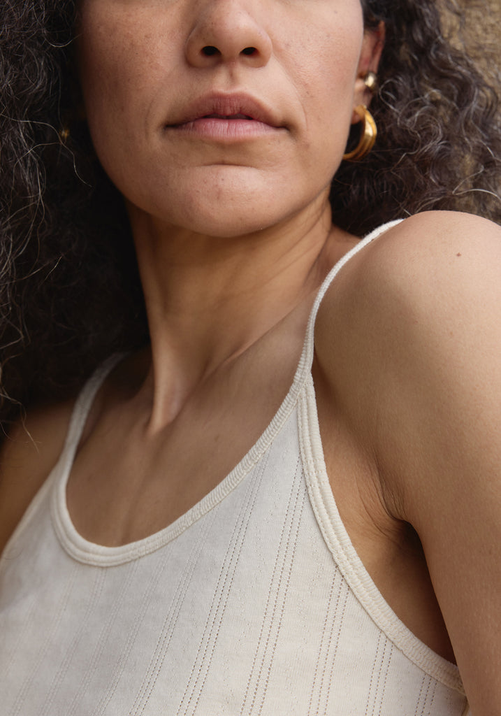 Introducing the softest organic cotton pointelle knitwear. An easy cropped camisole to pair with all your favorite high rise bottoms all Summer long.