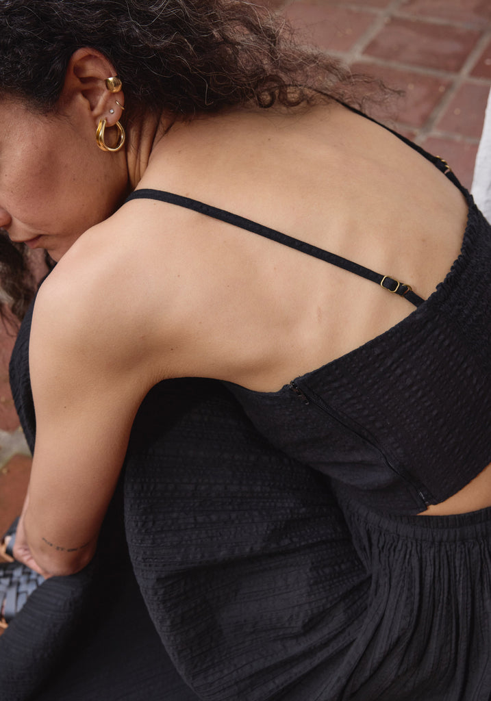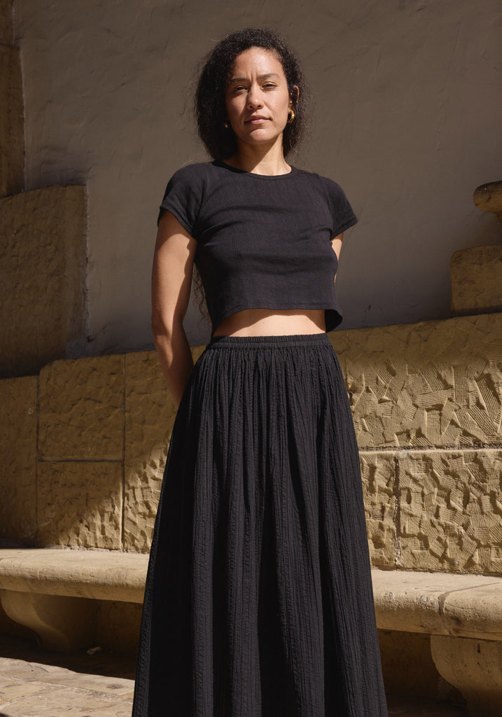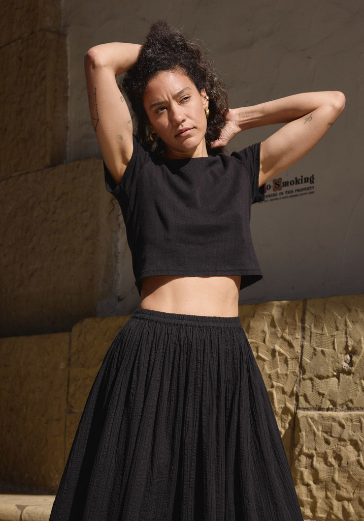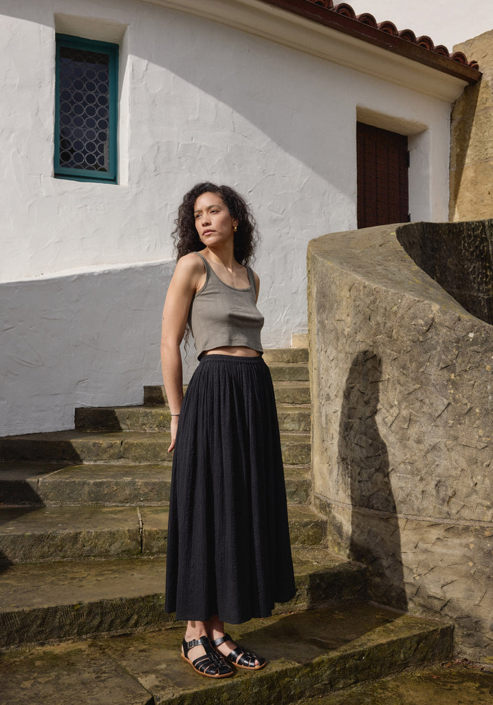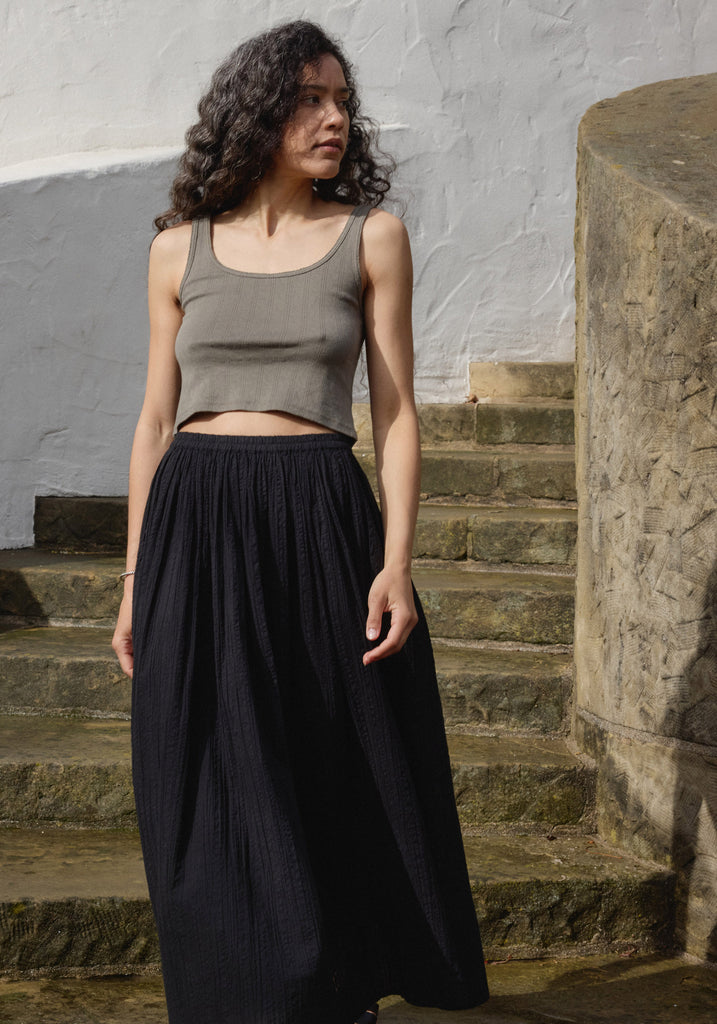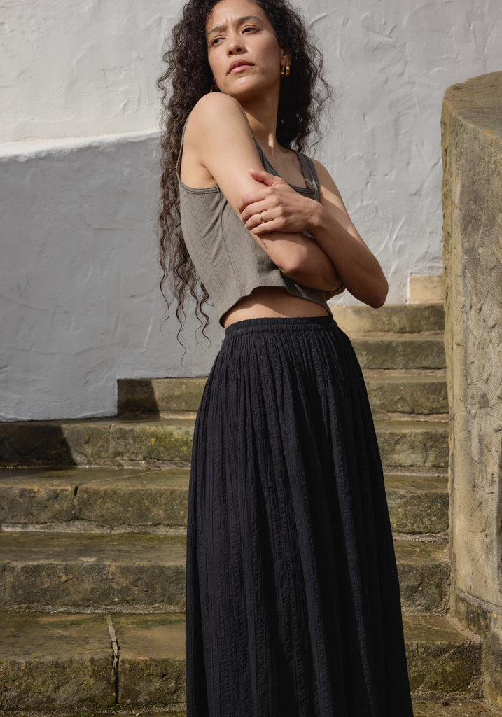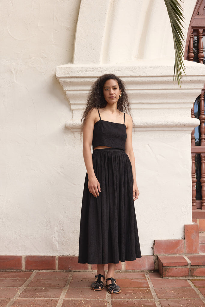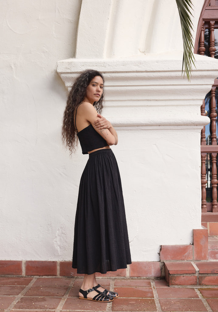 A voluminous skirt for everyday cut from the most beautiful textured cotton seersucker. Designed with a full elastic waistband with extra give for an easy pull on fit.