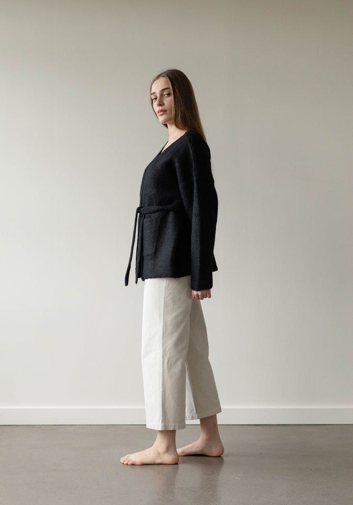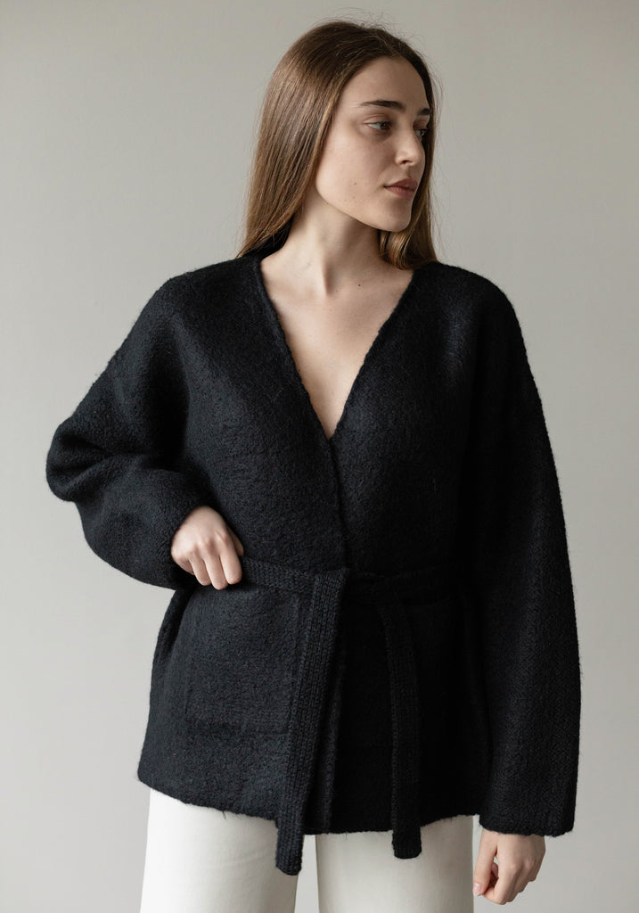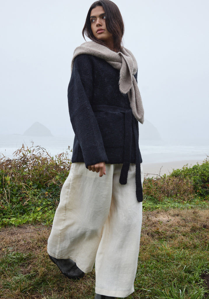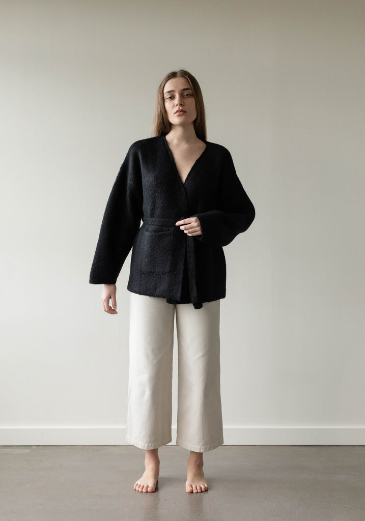 We are excited to re introduce this customer favorite cardigan in a new felted baby alpaca with updated styling. We removed the cuff for a cleaner sleeve sleeve and added two waist level pockets. The sweater coat was finished this season with a hand felted technique that adds a beautiful soft and fuzzy texture that feels both elevated and casual.